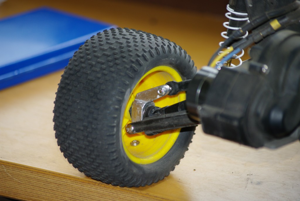 Kad, iepriekš minēto, pārbūvēto titāna dzinēju sajūdzu kopā ar jauniegūto zobratu komplektu 76:28, tukšgaitā pie pilniem apgriezieniem riepa bija uz izjukšanas robežas un brītiņu darbinot, noteikti izjuktu ar'. Uz šosejas ar šīm riepām un NiMn akumulatoru ieskrējās diezgan ātri, bet ar krietni mazākiem apgriezieniem, nekā tukšgaitā, - katrā ziņā, subjektīvi ņemot, ātrums nebija iespaidīgs un jaudas pietrūka, pat, lai nospolētu uz asfalta. Matorītis šito ņirgāšanos izturēja, karsa gan, bet vēl pieļaujamās robežās, t.i., plastmasas detaļas deformēties vēl nesāka. Tamiyas dzinējam apgriezienu ir mazāk, bet jauda lielāka - pamēģināju, ir labais, bet riepas asfaltam jāpasūta citas - šitamējās ALIAS fiksi uz asfalta nodils un, piedevām vēl, pagriezienos baigi izliecās tā, ka, liekās, aš' riteņa disks asfaltu skars. |