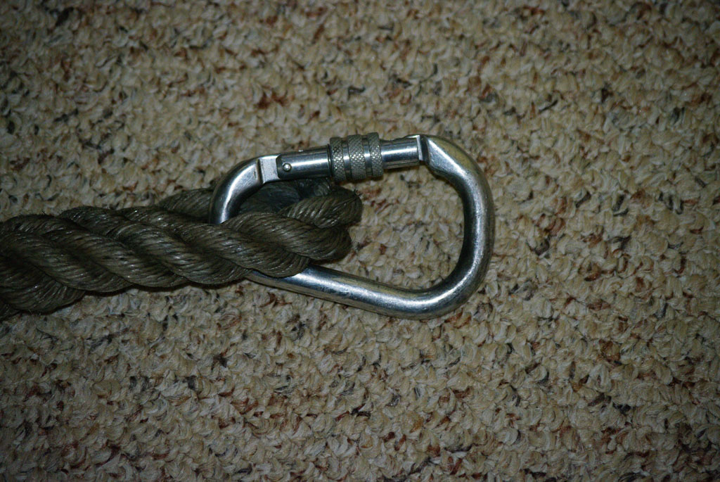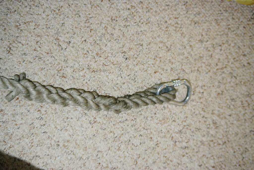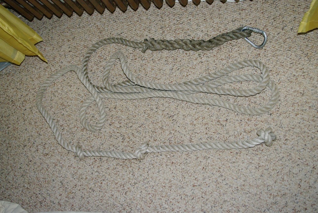 Es izvēlējos paresnu vītu celtniecības sintētiskās šķiedras trosi, kas visai līdzīga linu auklai. Izveidoju vienā striķa galā cilpu, karabīnes iestiprināšanai, pieāķēšanai mocim, troses galu iepinot atpakaļ trosē. Otrā troses galā iesēju dažus mezglus ar aprēķinu, ka pēdējais mezgls troses galā ir 6 metrus no otra gala t.i. 6m no gala, kas mezgla galam ir otrā galā. Karabīnei obligāts ir pretatvēršanās mehānisks bloķētājs - ar atsperi vien nepietiek, trasē taisās vaļā. Viss.