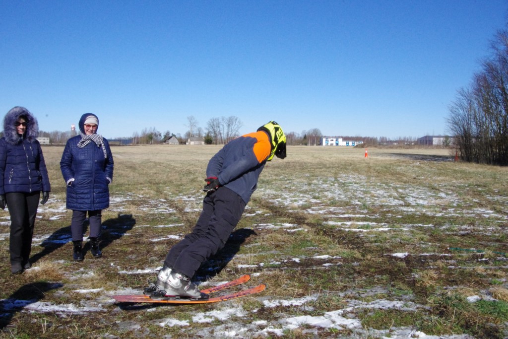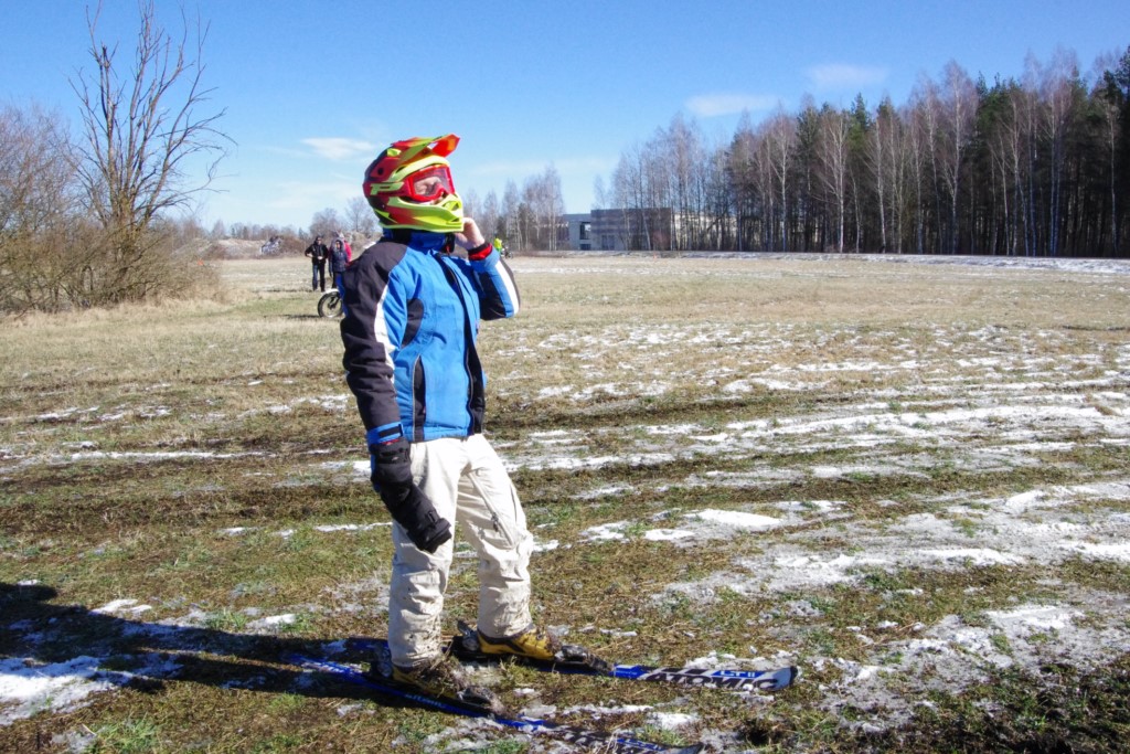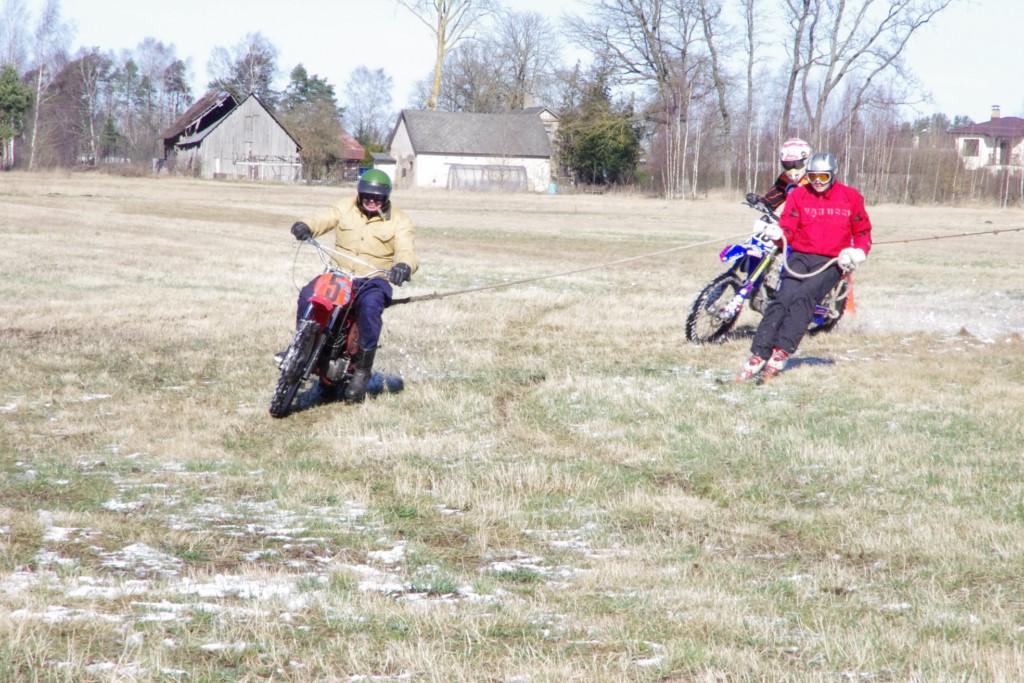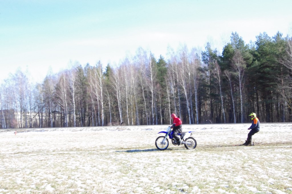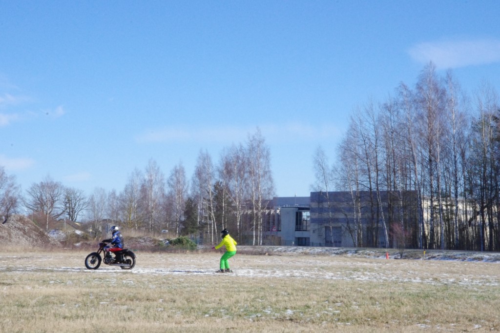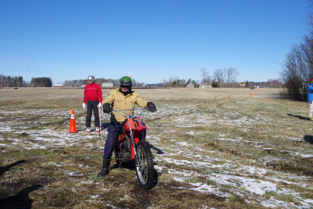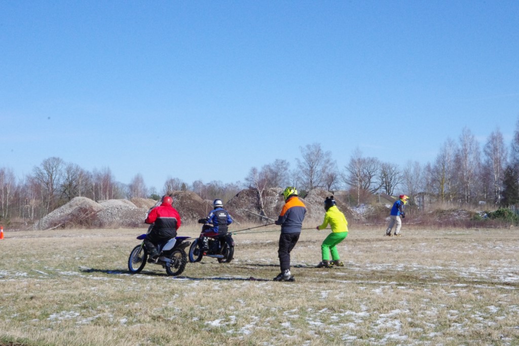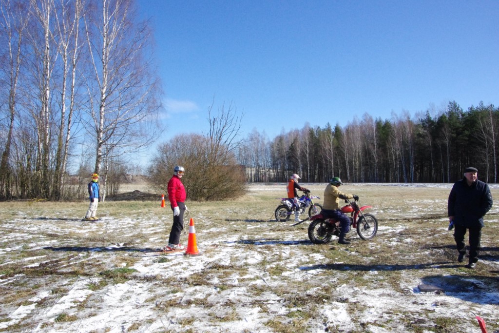 Laiciņu pēc piedalīšanās Korejas TV filmā "Sporta lielvalsts Latvija" mani vajāja doma papētīt tuvāk manis paša filmā nodemonstrēto skijoringa slēpošanu bezsniega apstākļos. 29.02.2020. gadskārtējā Latvijas motosporta veterānu tusiņā šo ideju pastāstīju Jurim Valeinim, un arī viņu šī doma šīgada apstākļos, kuros rudens plūstoši pārgāja pavasarī, ieinteresēja. Domāts, darīts un te, nu, mēs jau trešreiz ampelējamies ar skijoringu Jura pļavā, kurā vēl bik' kaukāds sniega pulveris saglabājies. Šodien saulīte. Divi braucieni pa trīs apļiem katrs. Protams, ka pļava ar pavisam drusku snega piebirumu nav nekāda medusmaize slēpošanai, īpaši ... otrajā braucienā. Bet tas sacensību zibens formāts trīs mazu apļu veidā ir, pat, slēpotājam, ...pat baudāms. Par bezsniega skija slēpošanas teoriju ko bišku uzrakstīju blakus sadaļā.