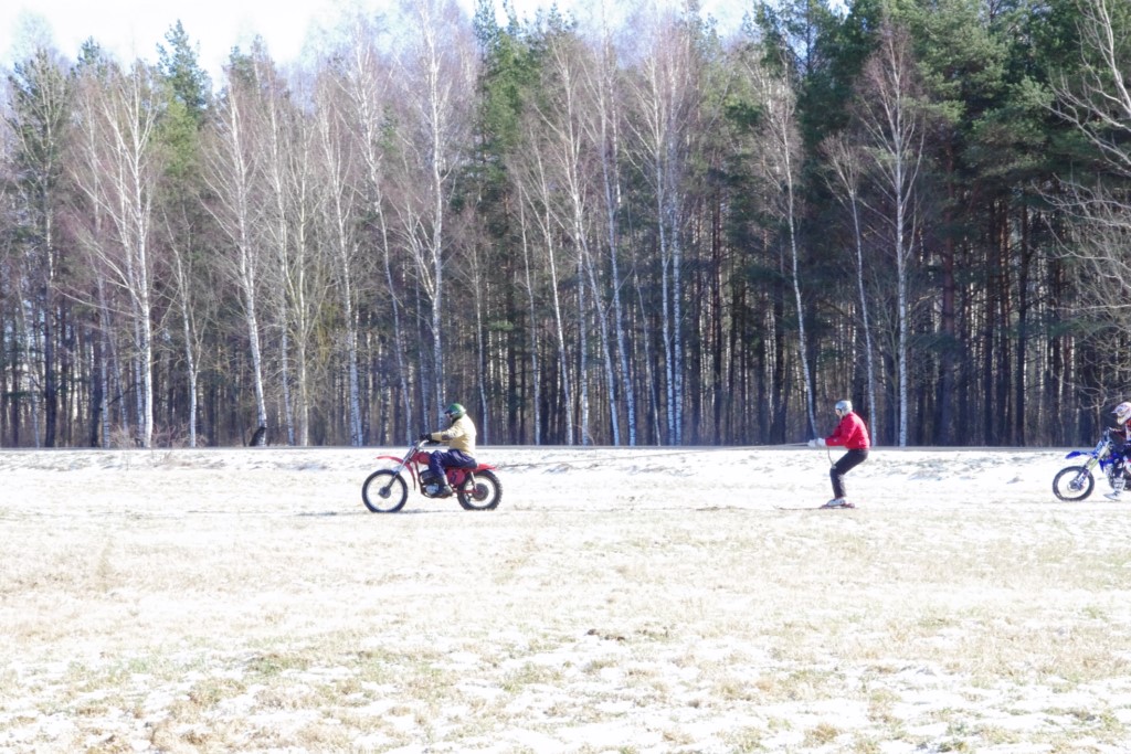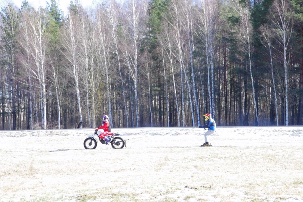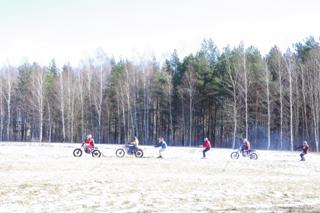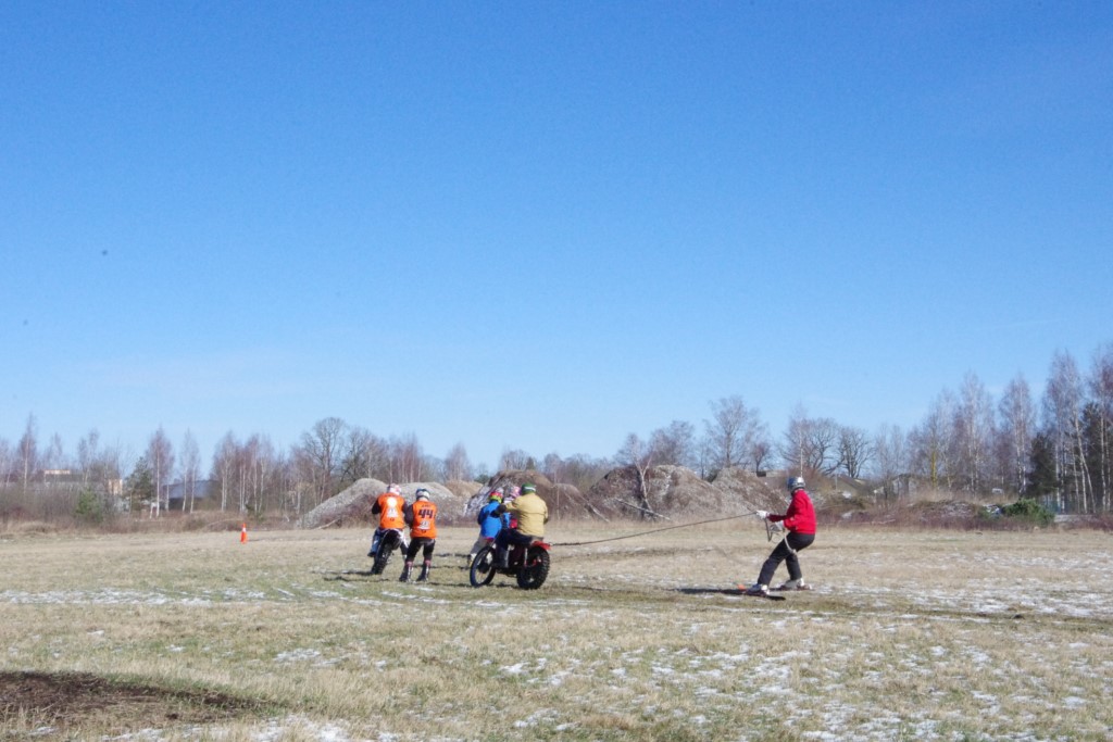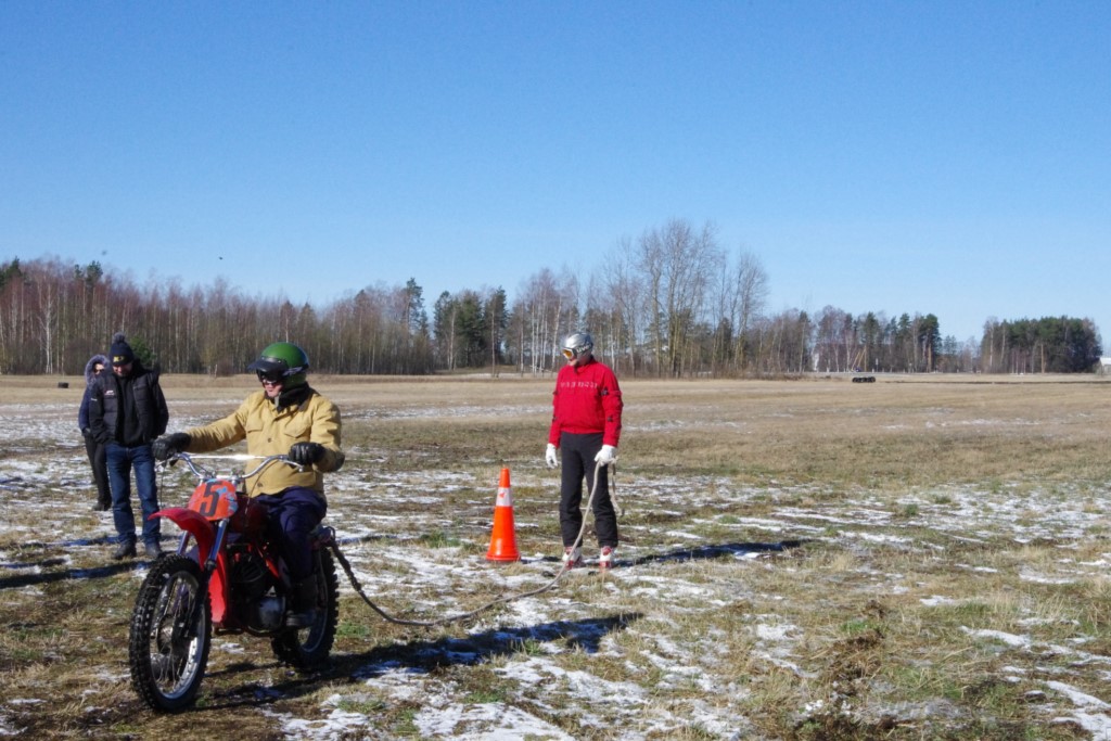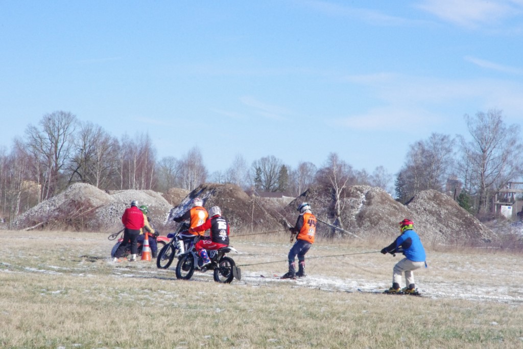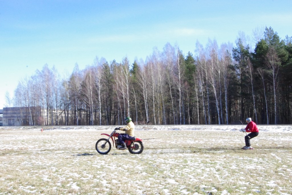 Laiciņu pēc piedalīšanās Korejas TV filmā "Sporta lielvalsts Latvija" mani vajāja doma papētīt tuvāk manis paša filmā nodemonstrēto skijoringa slēpošanu bezsniega apstākļos. 29.02.2020. gadskārtējā Latvijas motosporta veterānu tusiņā šo ideju pastāstīju Jurim Valeinim, un arī viņu šī doma šīgada apstākļos, kuros rudens plūstoši pārgāja pavasarī, ieinteresēja. Domāts, darīts un te, nu, mēs jau trešreiz ampelējamies ar skijoringu Jura pļavā, kurā vēl bik' kaukāds sniega pulveris saglabājies. Šodien saulīte. Divi braucieni pa trīs apļiem katrs. Protams, ka pļava ar pavisam drusku snega piebirumu nav nekāda medusmaize slēpošanai, īpaši ... otrajā braucienā. Bet tas sacensību zibens formāts trīs mazu apļu veidā ir, pat, slēpotājam, ...pat baudāms. Par bezsniega skija slēpošanas teoriju ko bišku uzrakstīju blakus sadaļā.